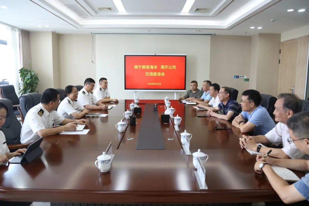 南寧郵局海關(guān)副關(guān)長(zhǎng)李良、余泳,南寧交投集團(tuán)副總經(jīng)理、港開(kāi)公司副董事長(zhǎng)周宏,港開(kāi)公司副總經(jīng)理藍(lán)澄、陳志杰及雙方有關(guān)部門(mén)負(fù)責(zé)人參加座談。(港開(kāi)公司 覃燕春)